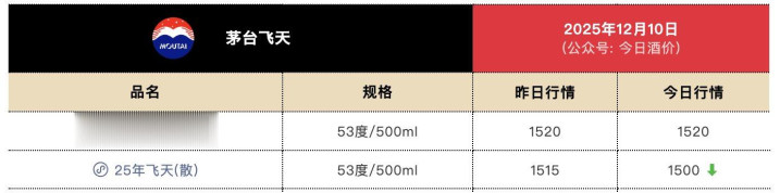 12月10日,第三方平台“当天酒价”数据炫夸,2025年53度500ml飞天茅台散瓶批发参考价已跌至1500元/瓶,较前一日下落15元,创下历史新低。原箱产物报价为1520元,与前一日握平。这一价钱已无尽靠拢1499元的官方携带价,较两款产物上线时的2220元、2255元累计跌幅均已向上30%。